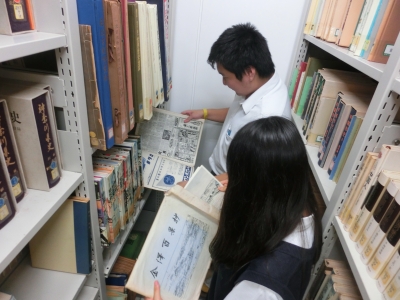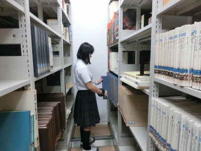 書庫の点検も生徒が行いました。書庫ではとても古い本や、見たことも無い本を見つけることができて楽しかったのですが、書庫にある本は一般の本よりも重いものが多く、本棚も天井に届くくらい高くて点検・整理するのが大変でした。