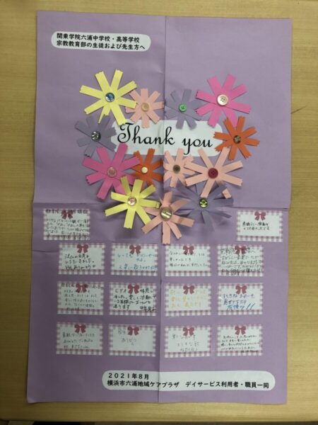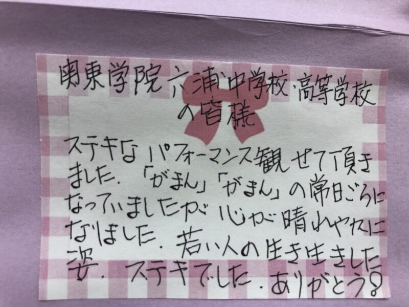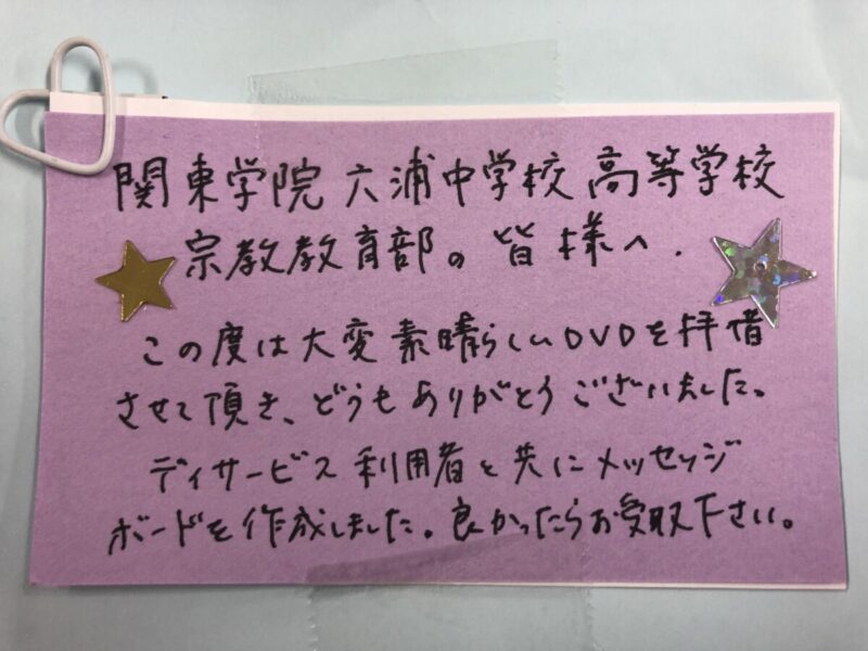 例年訪問させていただいている8か所の施設へ、完成したDVDを送らせていただきました。夏休みが終わり、少しずつDVDが返却され始めているのですが、ご覧になった高齢者の方々からメッセージボードやその時の様子と共に感謝のお手紙をいただいています。予想以上の反響に驚きましたが、ほんの少しでも楽しんでいただけたのなら、こんなにうれしいことはありません。また、わざわざメッセージをくださったお心遣いに、こちらこそ感謝の気持ちでいっぱいです。