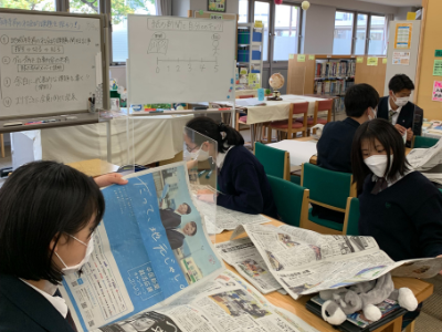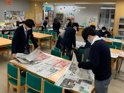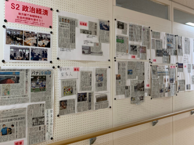 本校はNIE(Newspaper In Education)の推進指定校となっています。図書館を活用し、さまざまな学年・教科で新聞を使った取り組みを行っています。今回は、高校2年生と3年生の政治・経済での授業における取り組みを紹介します。