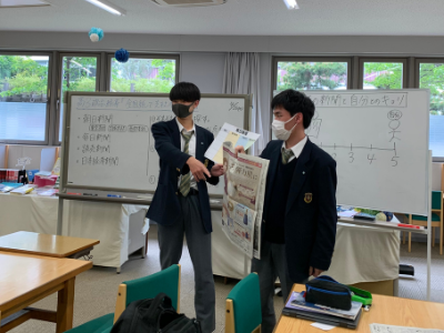 高校2年生では、「地方紙で地域特有の社会的課題を探そう!」をテーマに、紙の新聞に触れる機会をもちました。新聞博物館より新博キットの1つとして全国の地方紙を頂き、その地方紙を用いて、8つのグループに分かれ、各地方の特有の社会的課題がわかる記事を探しました。8つのグループは、北海道グループ、東北グループ、関東グループ、中部グループ、北陸グループ、近畿グループ、中国・四国グループ、九州グループでした。グループの中でも、1人ひとり手に取る新聞は異なります。例えば北海道グループでは、「室蘭民報」や「釧路新聞」など他多数ありました。新聞を読み、地域特有の記事が見つかった後は、グループで1枚の紙に記事を貼っていきます。全員の記事が貼り終わると、グループ内で記事の説明をし合って共有します。グループごとに地域が抱える課題をまとめ、最後は全員に発表・共有をしました。