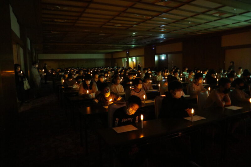 2日目は伊豆最大の浄蓮の滝を見学しクラスごとに写真撮影。その後、狩野ドームにてクラス対抗での大縄跳び、ドミノ倒しやドミノタワー作りを通して、目標に向かって協力することや失敗しても相手を許容することを学びました。夜にはキャンドルライトサービスが行われ、自分のキャンドルを見つめながら「地の塩として他者を活かすこと」「世の光として他者を導くこと」の意味を考える時間となりました。