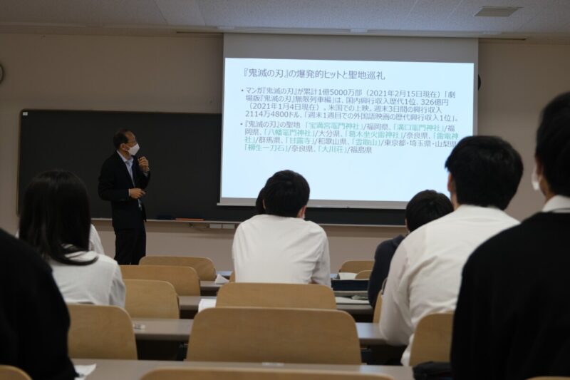 先生が去年研究した鬼滅の刃の大ヒットの理由や、旅のカタチの歴史、アニメの聖地巡礼が地域にどのような影響を与えて行くのかを講義を通して学んだ。聖地巡礼の目的はモノではなくその場所で起きた物語を消費するため、新たに観光開発をする必要がない。そのため地域を破壊することがなく観光することができ、聖地巡礼が流行ることで何もない田舎でも観光開発をせずに地域を活性化させることができるという話が一番記憶に残った。