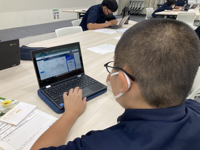 最初は何を言っているか理解できない生徒も多くいましたが、講師の方の分かりやすい説明で、最終日には時間をオーバーしながらも、いくつかのチャート表を見ながら、社会情勢を話し合い、購入する株式を決めていました。この講座では学校の教員がメインで話をするのではなく、株取引のプロの方から話を聞くことができるところがポイントで、終了時間後も残って質問する生徒が多くいました。