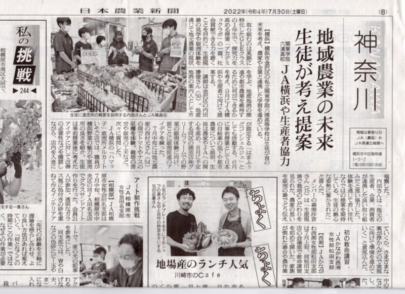 この度,その様子が日本農業新聞へ掲載されました。今後は,夏休み明けにグリーンファームにて販売体験をし,9月末にはJA横浜や農家さんに対して提案を発表する予定です。