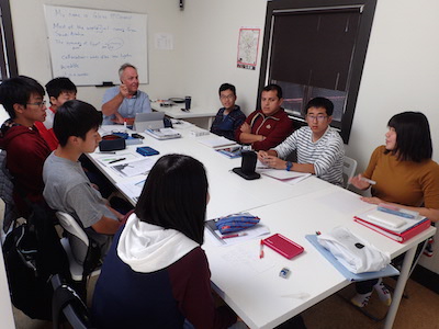 先日受けたレベルチェックテストとALH(ANNE’S Language House)の野崎さんとの面接により、生徒たちは3つのクラスに分かれました。初心者のクラスを教えるのはジェーン先生です。日本にも来たことのあるジェーン先生は、大変優しく教えてくださいます。レギュラークラスを教えてくれるのはグレン先生です。大変熱心な先生で、生徒たちは嫌でも英語での発言をしていかなければなりません。生徒たちはすぐに積極的に発言するようになりました。ハイレベルクラスはネルソン先生です。昨年も本校の生徒たちを教えてくれたネルソン先生は、ユーモアを交え、大変楽しい授業をしてくださいます。この日は「真の男とはどんな男か?」という題で、ディスカッションをしていました。(もちろんすべて英語ですので、本校の生徒も必死に頑張っていました!)