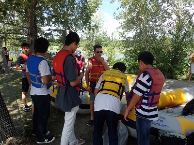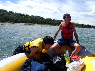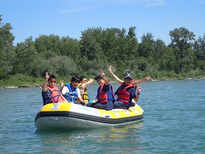 この日は土曜日でしたので、午後は自由になります。女子5人は街を散策したり、ファミリーと過ごしたりゆっくりと楽しむようです。男子7人はオプションで申し込んだボー川のラフティングです。大変穏やかな川なので、カルガリーの自然を満喫しながら、ボートでランチをとったり、景色を眺めたりして楽しんでいました。このラフティングには、スイスから来てこれから一緒に学ぶベン君も一緒に参加してくれました。生徒たちは、これから英語での会話を楽しんでくれることでしょう。