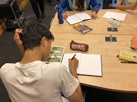 初日の午前中はオリエンテーションとクラス分けのテストでした。時差ボケとも戦いながら、みっちり2時間受けました。午後は歩いて10分くらいのところにあるモールへ。本屋さんへ行き、滞在中に読む本を自分で1冊買いました。日本ではせいぜい、教員が選んだ中から…とか、図書館の中から…と、限られていますが、大きな本屋の中から1冊洋書を選ぶという体験は新鮮です。どこのコーナーに行けばよいのか、どれくらいのレベルのものを選べばいいのか、真剣に悩んでいる生徒たち。自分で選んだからこそ、この1冊は大事に読んでほしいです。