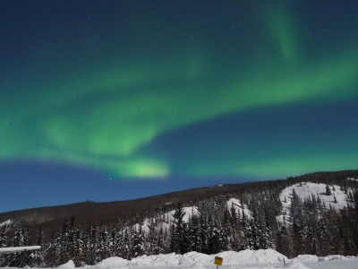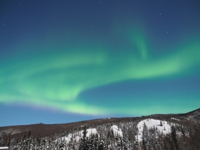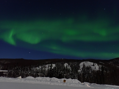 その前にオーロラが見られることを期待しましたが、期待以上のきれいなオーロラを見ることができました。今回見たもののうち、最高のものでした。北の空から煙のように上がってきたオーロラは、カーテンのように揺らめきながら、南から西へと移動していきます。出現している時間も長く、大満足。たくさんの写真を撮ることができました。