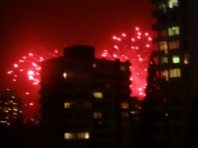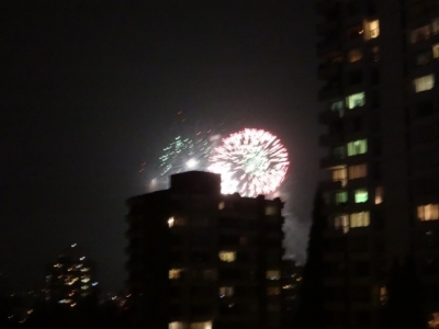 開始時刻が22:00からだったため(バンクーバーは緯度が高いため日の入りがとても遅いのです)残念ながら私たちはホテルに待機でしたが、それでもラッキーだった人はベランダから花火を見ることができました。