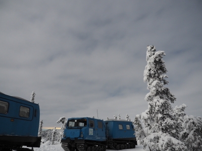 21時30分、チェナホットスプリングス(滞在地)から山頂に雪上車に乗って移動しました。移動中はかなり揺れましたが、約30分間で到着しました。モンゴルの移動式住居のゲルのようなテントが一つだけあり、その中で暖をとりました。そこでカメラなどの荷物を置き観測の準備をしました。