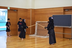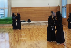 日頃は面打ちなどの基礎練習を第二体育館で週3~4日行います。人数は少ないながらも、気合の入った大きな声を響かせて練習しています。