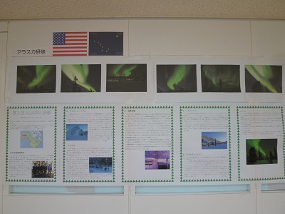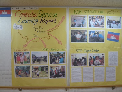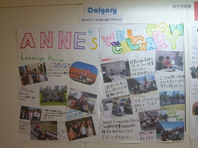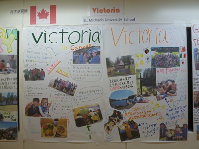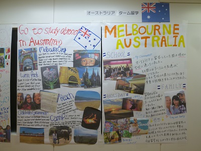 この国際センターの前の廊下には、本校で行っている海外研修に参加した生徒達による研修内容の紹介(模造紙)の展示があります。先日の六浦祭(文化祭)でも展示や発表を行いました。