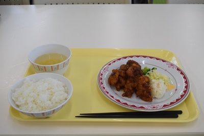 チキン南蛮は揚げ鶏に南蛮ソースを絡めるものを想像しましたが、ここの食堂では、揚げ鶏を南蛮だれに浸したものでした。