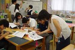 脚本を書いた人やキャラクターを考えた人に確認しながら、また周りと相談しながら、和気あいあいと楽しく、集中して取り組んでいました。