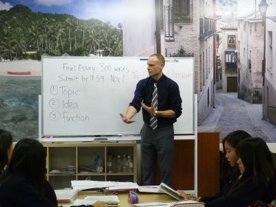 この日の授業では、生徒は4~5名で班を作り、先生の問いに対して班で意見交換をするなど熱心に取り組んでいました。4月からのこの半年間、エッセイの書き方、構成について学んできましたが、本時はイタリアの有名な観光地に関する文章を読み、各段落についてTopic、Idea、Functionを考えるというものでした。Topic、Idea、Functionがどういうものかを映画”Titanic”を例にショーン先生が詳しく説明し、それを踏まえて、本日の文章を構造的に捉えるという練習をしました。日本語で行うのも難しいことを英語で行うのはなかなか“迫力”があります。リスニングに慣れている生徒にとって、先生の説明や指示を理解するのは容易、出された英語課題を英語でどう処理するかに頭を悩ましていました。