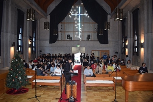 だんだんと冬へ近づいてるなと感じる11月17日(土)、素敵なクリスマスの装飾がされた関東学院大学のチャペルから歌声が聞こえてきました。今回初めて行う「クリスマス・ゴスペル礼拝」の準備が行われていたのです。