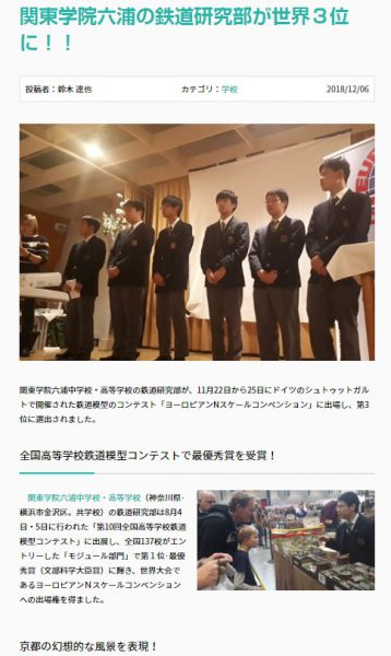 今夏行われた全国高等学校鉄道模型コンテストへ出場した本校鉄道研究部は、このコンテストで最優秀賞(文部科学大臣賞)をいただきました。その受賞を受け、ドイツで行われた「ヨーロピアンNスケールコンベンション」へ招待され、第3位を受賞しました。