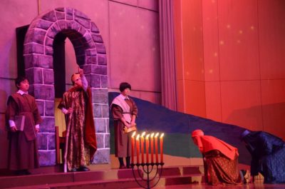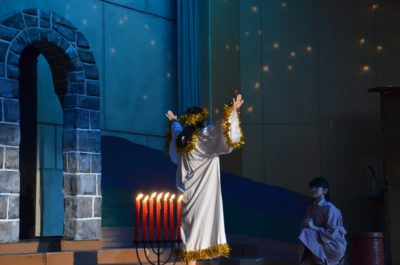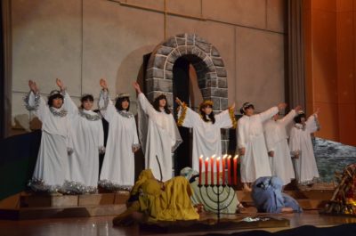 礼拝の中盤では、生徒たちによる聖誕劇(ページェント)が行われました。聖書の物語を通して、イエス・キリストの誕生を演じます。この日の本番に向けて何度も練習を重ねてきました。この聖誕劇は第一場から第五場で構成されています。
