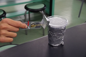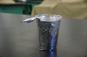 ライデン瓶は静電気を蓄えることができるもので、小学校で学ぶコンデンサーと同じ仕組みです。プラスチックのコップ、2枚のアルミホイルとセロテープだけで作れます。