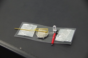 こちらはLEDやトランジスタといった近くのお店では売っていないようなものが必要です。コイン電池と一緒に電極になるアルミテープなどでプラスチックシートに固定します。トランジスタから出ている3本の足や、LEDの長さの違う2本の足の接続を間違わないよう気をつけながらつなぎます。大学生の方々に手伝ってもらいながら、何とか完成しました。