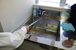 塩ビ棒をこすってチェッカーに近づけると、LEDが光りました。塩ビ棒の電気はマイナスだということが分かりました。