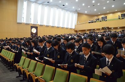 最後に、本校での学びは、校訓として掲げる「人になれ 奉仕せよ」に収斂するものであることを伝えたいと思います。校訓「人になれ 奉仕せよ」の精神の土台は、キリストの教えであることを伝えます。本校での学びの根底にあるものは、どの時代にあっても揺らいではいけない、神がキリストを通して示した「自分を愛するように隣人を愛する」精神であること。このことを胸に刻んで新しい日々を歩み出してほしいと思います。