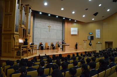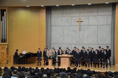パイプオルガンの奏楽とともに礼拝堂へ入場してきた新入生の皆さんは少し緊張した面持ちでしたが、これからの学校生活への期待に満ち溢れていました。本校の入学式は礼拝形式で行われます。聖書の言葉に耳を傾け、初めての讃美歌に少し戸惑いながらも、みんな一生懸命賛美していました。