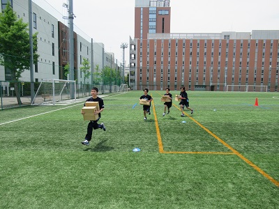 面白リレーは2種類。一つめは4人で一つずつ段ボールを積み上げながら走る「宅急便」。当然4人目の走者は4つの箱を落とさずに走らなければならず悪戦苦闘しながらゴール。そして二つめは、卓球のピンポン・テニスボール・バスケットボール・バレーボールのいずれかを2人がラケットで挟みながら走る「テニスラケットでボール運び。」ハプニング続出の面白リレーでしたが、最後にゴールする選手には終始温かい拍手が送られていました。