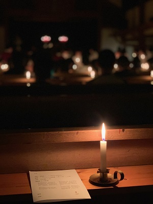 2日目、礼拝と体操、朝食を済ませた後は、浄蓮の滝へ向かいながらのハイキングです。初日の七滝とは、また違った雰囲気の壮大な滝を眺めることが出来ました。山荘に帰ってからはしばしの自由時間の後、体育館でのレクリエーションです。大縄跳びでは、クラス毎に飛んだ回数を競いました。その中で、最後まで諦めずに縄を飛ぼうとする姿や、思うように飛べないクラスを、他クラスの生徒が応援する声援が飛び交う姿に、心が熱くなる思いでした。ドミノ倒しとドミノ積み、ドミノ片付けの各競技では、生徒たちはとても集中して取り組み、結果発表の際には大きな歓声が起こりました。そして最後のフォークダンスは、勝負を意識したものとは異なり、とても和やかな雰囲気で、クラスを超えて出来た2つの大きな輪の中で、互いに手を取り合い、声を掛け合い、生徒たちが心から楽しんでいる姿が印象的でした。2日目の夕食後は、オリエンテーションの醍醐味ともいえるキャンドルライトサービスです。生徒たちによる司会進行、チャペルに響く聖歌隊の歌声とオルガンの音色、友からもらい受け友へと受け渡すキャンドルの炎。一つの空間の中に、学年全員が集まり、ろうそくの火の光だけで過ごすという貴重な経験が出来、心に残る素晴らしいキャンドルライトサービスとなりました。