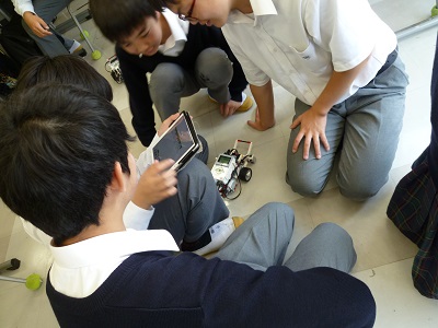 各グループに分かれて、まずはipadでBluetoothを使って無線で接続します。その後、画面内のブロックを繋げて設定しながら、ロボット本体を動かしました。初めはボタンの操作がわかりませんので、とにかくいろいろ試してもらい、グループ内でお互い教え合いながら動かしました。