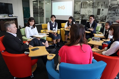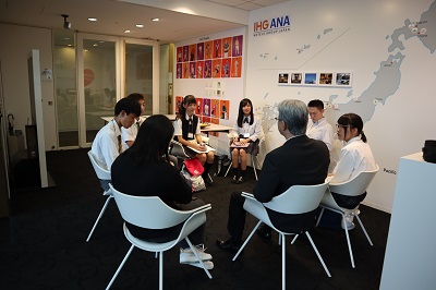 会場となったIHG・ANA・ホテルズグループジャパン本社では、本校生徒が積極的に社員の皆さまに質問や意見を述べ、社員の皆さまも適切な助言を生徒たちに投げかけていました。外資系会社であるので外国人の社員もいて、生徒たちが英語でメンタリングを始めると、その場に同席していたIHG・ANA・ホテルズグループジャパンの清田最高執行責任者(COO)様からも「素晴らしい生徒たちだね」というお褒めの言葉もいただきました。