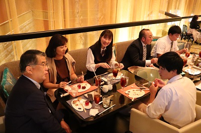 クイック・メンタリング終了後は、近隣にある同社のANAインターコンチネンタルホテル東京に場所を移して、生徒と社員の懇親を目的とした「アフタヌーンティーパーティ」がおこなわれ、キャリアの話をはじめ、生徒たちの大きな夢について、より具体的な話しとなり、和やかな中にも一本芯の通った会話が弾みました。会が終了後も社員様たちと記念撮影をするなど、短時間ではありましたが貴重な時間を持つことができました。