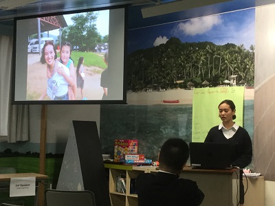 夏休み中に行われたカナダ研修、北海道研修の他、1月に実施したセブ島語学研修(今年度からはオルティガスに変更)やターム留学などの発表です。学校の研修だけでなく、個人で参加したタイの訪問団やアフリカのボランティア活動の発表も行われました。
