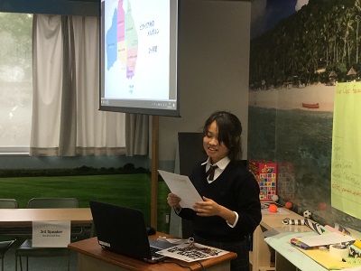 大雨の降る中でしたが、発表する生徒の保護者の方々も参加してくださいました。また、オーストラリアやマレーシア、ニュージーランドへのターム留学をした生徒の発表時には、GET(本校の外国人教員Global English Teachers)も会場にて、生徒達の発表に耳を傾けていました。発表後の質問タイムでは、GETからの英語での質問に対して、生徒達も英語を駆使して答えていました。ターム留学の成果の一端を垣間見ることが出来たように思います。