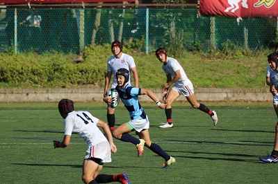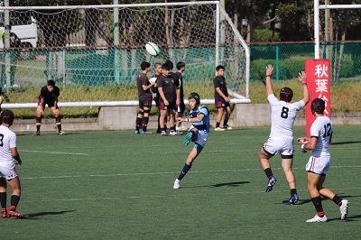 ラグビーワールドカップの影響か、満員のスタンドの中、本校のキックオフで試合が始まりました。前半開始早々から日大高の気迫溢れるプレーに本校が簡単なところでミスをし、なかなかペースが作れません。前半最初のトライを取ったのは本校ですが、その後も大事なところでペナルティーをし前半を7-0の本校リードで折り返します。