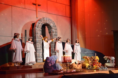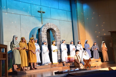 礼拝の中盤では、生徒たちによる聖誕劇(ページェント)が行われました。聖書の物語を通して、イエス・キリストの誕生を演じます。この日の本番に向けて何度も練習を重ねてきました。この聖誕劇は第一場から第五場で構成されています。
