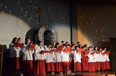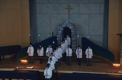 聖誕劇が終わると、吹奏楽部による「カンタベリー・コラール」の演奏とともに、キャンドルを持った生徒たちがゆっくりと入場してきます。歩調を合わせてステージまで行き、十字架体形のキャンドルライトが完成します。