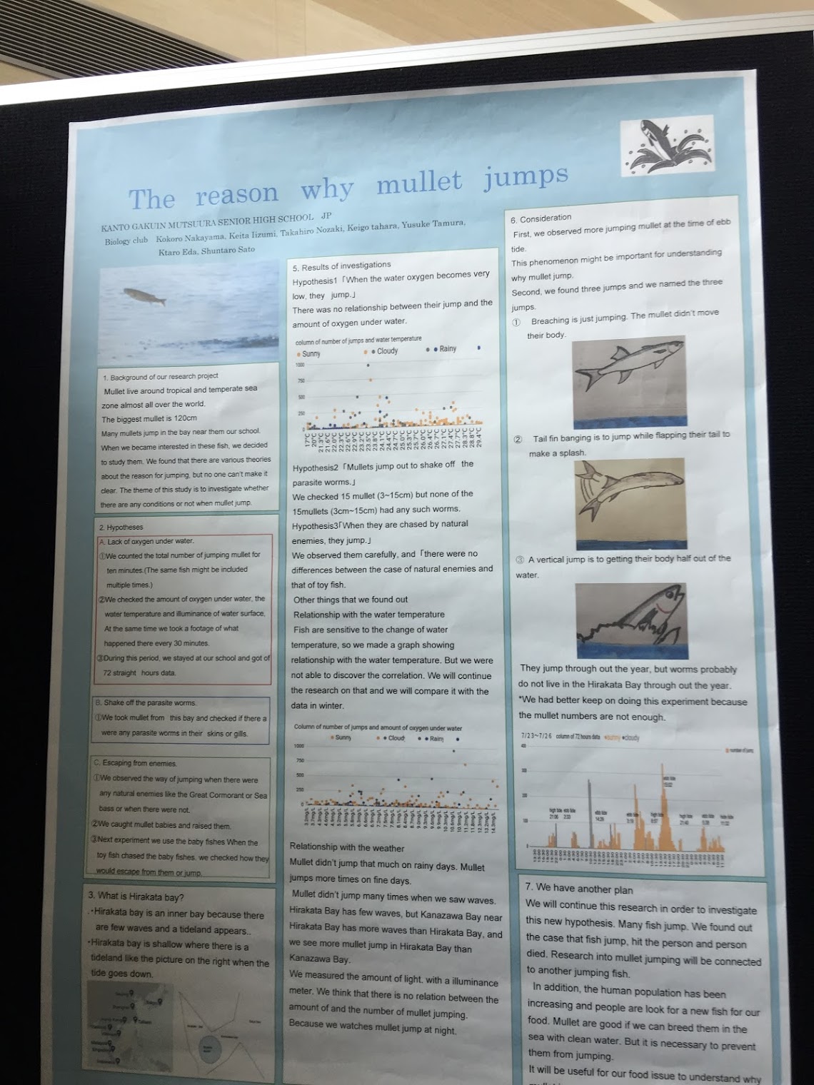 本校の生徒達は「ボラのジャンプ」について発表しました。学校の近くにある平潟湾や学校の前を流れる侍従川ではボラが大量に跳ねているときもあれば、全く跳ねていないときもあります。その様子を見て、「なぜボラは跳ねるのだろうか」という疑問から始まった研究です。10分間ボラがジャンプした数をカウンターで測定し、そのときの溶存酸素量や水温、明るさなどを記録し、それぞれの条件とボラのジャンプとの間に関連性を見つけ、なぜ跳ねるのかを解明するという目標を立てました。発表者だけでなく、部員総出で300回くらい調査を繰り返しました。10分間のジャンプ数は0~700回、結果、思いついたすべての条件が観察結果から否定され、解明には至りませんでした。代わりに、4つの事実を見つけました。