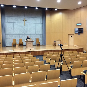 また、時間割の中には礼拝も組み込まれます。こんな状況だからこそ、生徒たちには心を落ち着ける時間を大切にしてほしいと思っています。先日、礼拝堂にて宗教主任の礼拝を撮影しました。