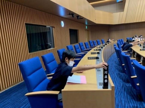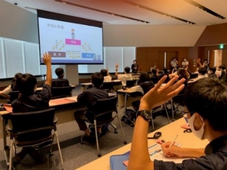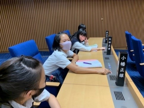 また、様々な横浜市の政策が決められる市議会場の議員席に座らせていただき、生徒たちは緊張しながらも興味深く市議会の運営や議場のシステムなどの説明を聞いていました。