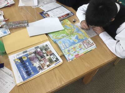 生徒は、「どうしてこの資料とあの資料で書かれている人口が違うのか」や「ネット検索だったらすぐ出てくるのに」など、苦労しながら書籍で調べているようでした。次回以降はそれぞれの観点について、さらに詳しく調べてまとめていきます。