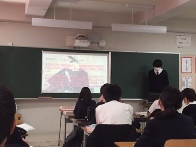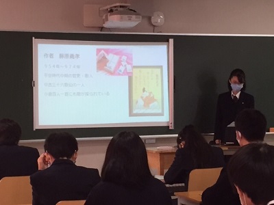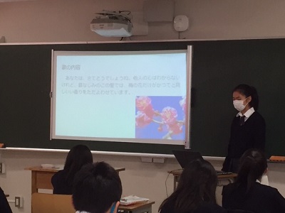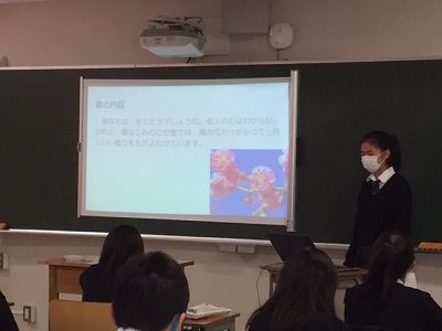 映画に取り上げられ以前より身近な和歌ですが、一人で調べ、緊張を抑えながら皆に伝わるような声や表情で発表し、質問に答えることにより、発表者はもちろんのこと聴いている生徒も深い理解を得られる取り組みになりました。